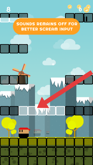3、上方提示關(guān)閉聲音以獲得更好的尖叫輸入效果,玩家需通過尖叫等方式控制角色向上移動,躲避障礙物,利用平臺不斷向上闖關(guān)。
