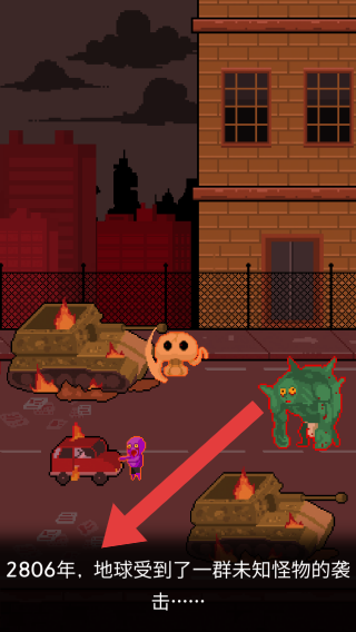 1、呈現(xiàn)2806年,地球受到一群未知怪物的襲擊……的末世背景,通過復(fù)古像素畫面展現(xiàn)末日怪物侵襲的世界觀設(shè)定。