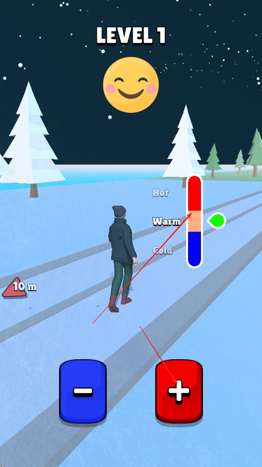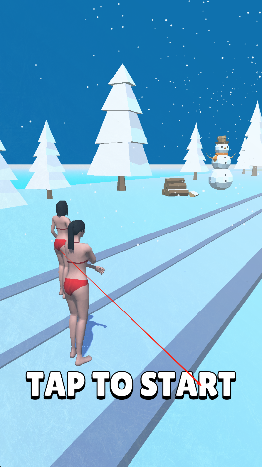 1、點(diǎn)擊屏幕開始游戲,操控小姐姐在雪地賽道上開始奔跑,通過不停點(diǎn)擊+-兩個符號,收集沿途的初始衣物和道具,抵御寒冷。