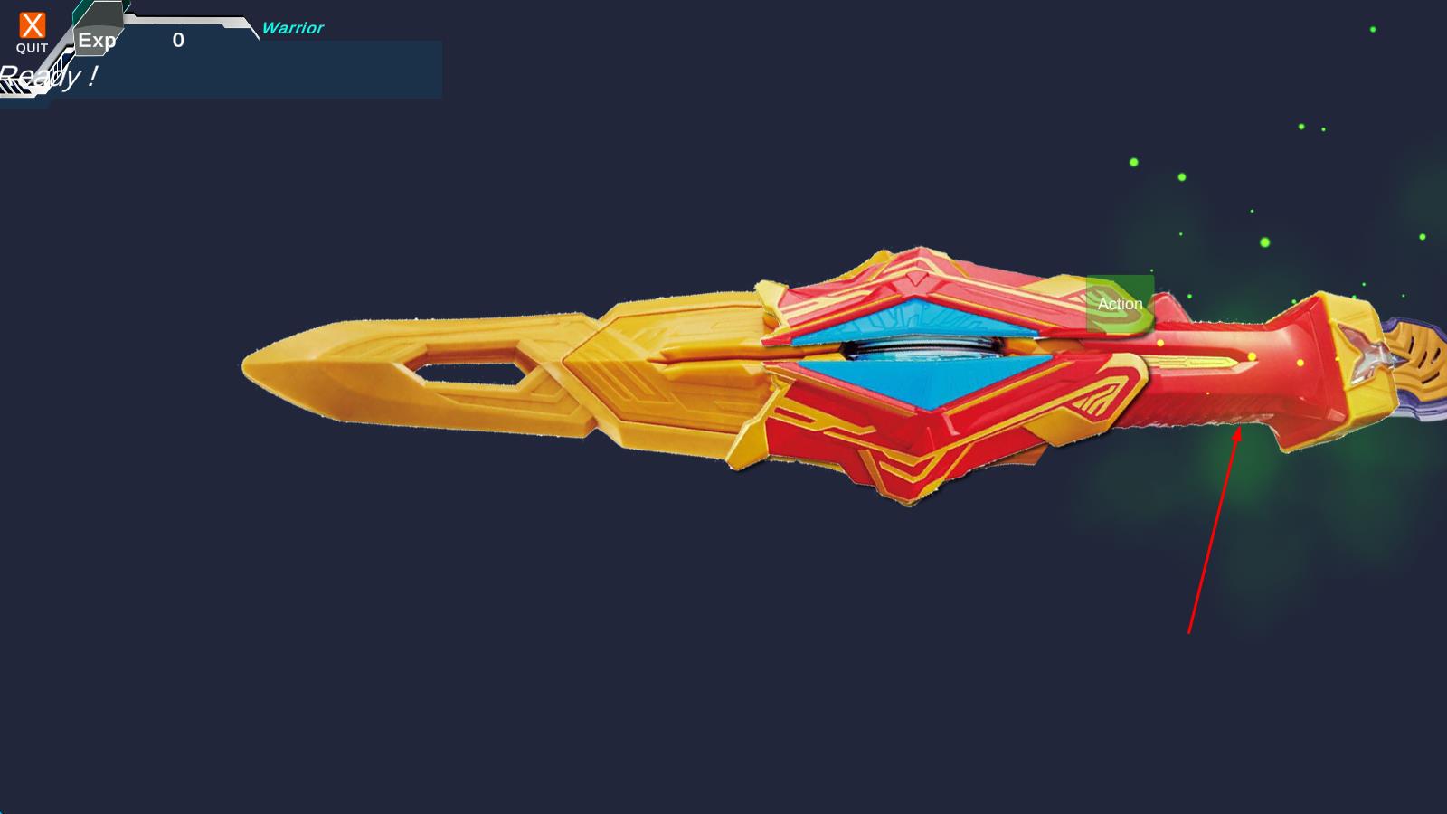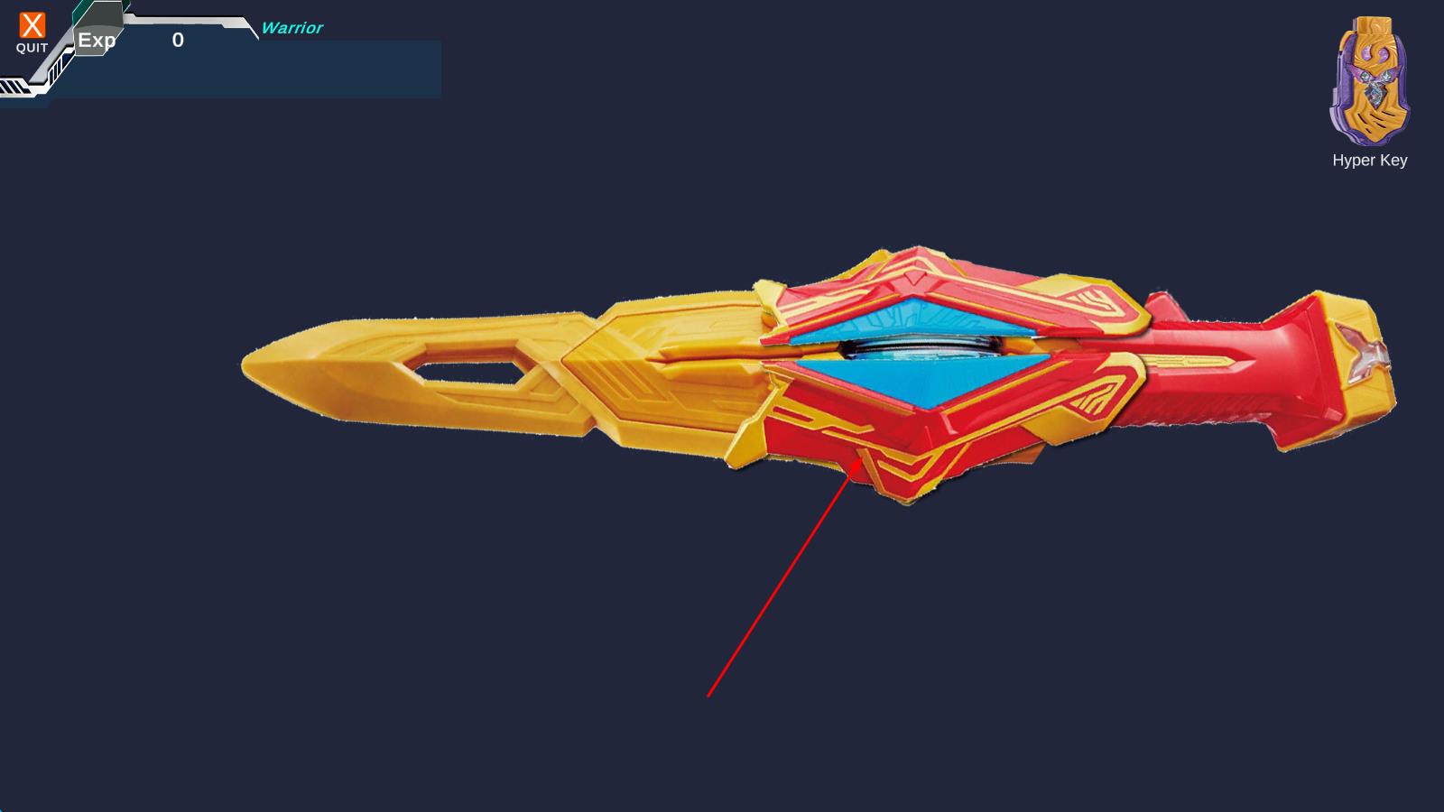 1、打開游戲,屏幕中央橫放著處于特利迦模式劍格收束的奧特二重劍,插入奧特次元密鑰,點擊右側按鈕啟動武器。