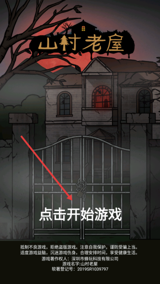 1、點(diǎn)擊開始游戲,進(jìn)入山村老屋場景,觀察環(huán)境細(xì)節(jié),嘗試點(diǎn)擊鐵門等互動(dòng),開啟解謎。