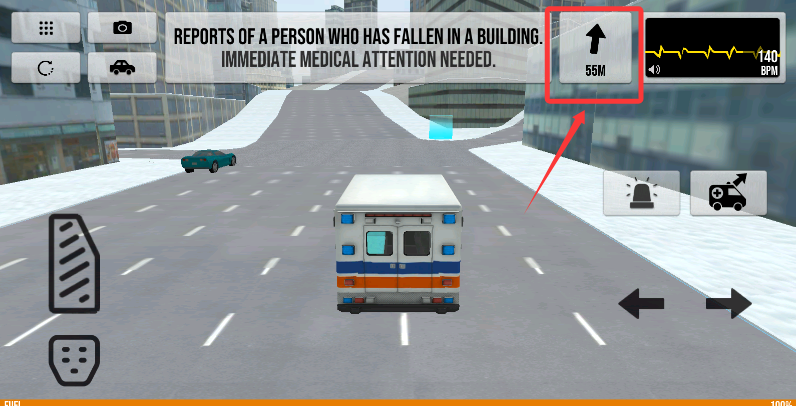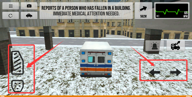 3、使用左側(cè)油門(mén)剎車(chē)和右側(cè)方向盤(pán),駕駛救護(hù)車(chē)前往事故現(xiàn)場(chǎng)。