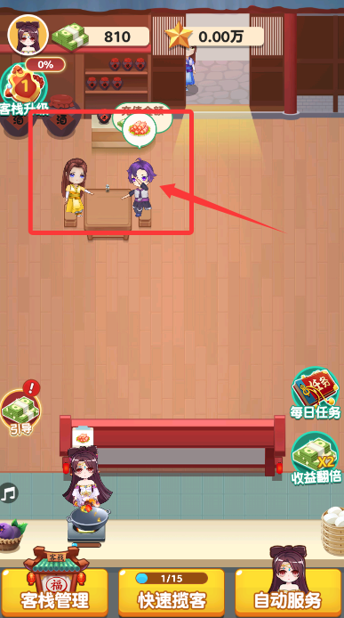1、進入游戲主場景后,留意顧客入座情況,及時啟動接待服務程序。