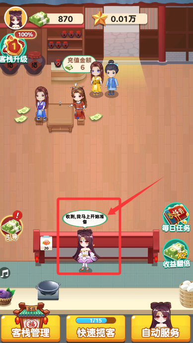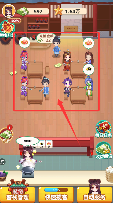 2、完善的收益成長體系,從街邊小館到豪華客棧的升級路徑清晰,完成日常任務和成就挑戰(zhàn)可獲得豐厚獎勵,加速發(fā)展。
