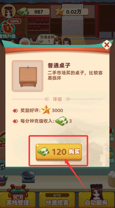 3、盈利達到標準后,進入裝修界面選購新餐桌,提升接待容量。