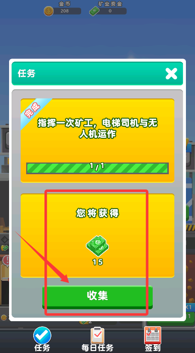 4、達成目標后,前往任務中心點擊領取,獲得15資金采礦專用資金。