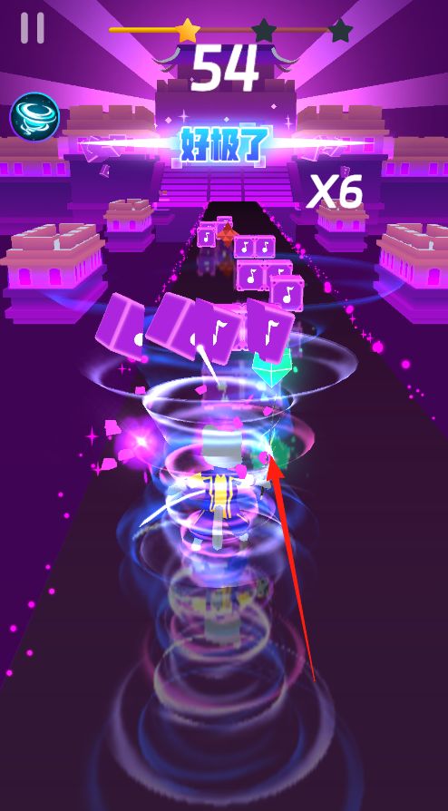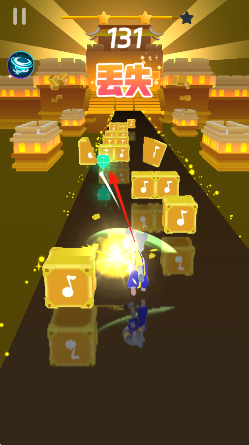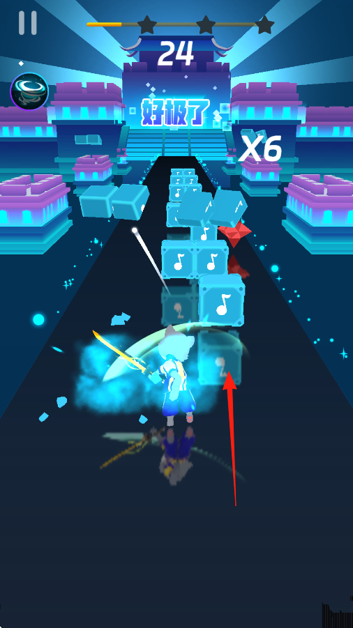 1、操控角色,用劍按箭頭指向切割藍(lán)色音樂(lè)方塊,跟隨節(jié)奏,保證連擊。
