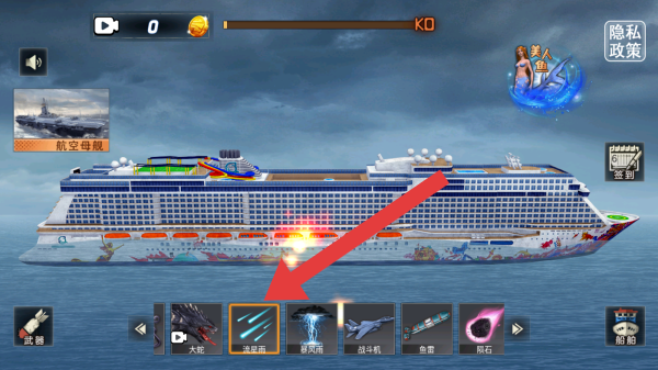 2、展示了航空母艦艦船,點(diǎn)擊流星雨摧毀的技能方可摧毀船只,呈現(xiàn)出艦船戰(zhàn)斗準(zhǔn)備或操作界面。