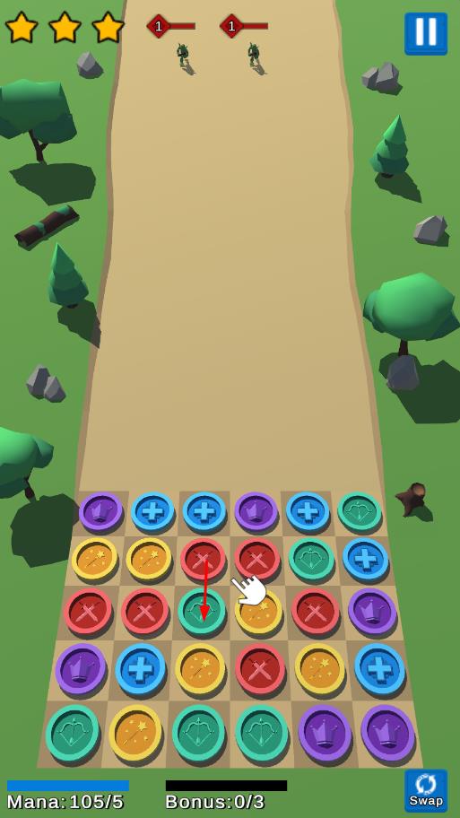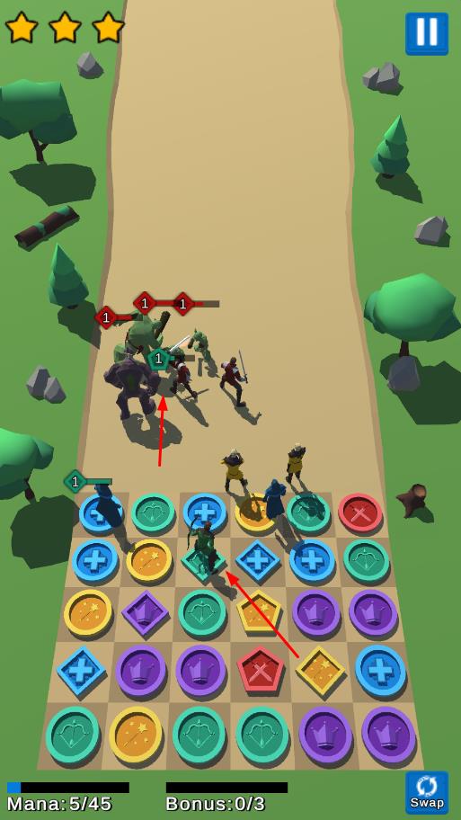 2、消除符文召喚對應(yīng)兵種,如綠色符文召喚射手,布置在棋盤,阻擋敵方進入。