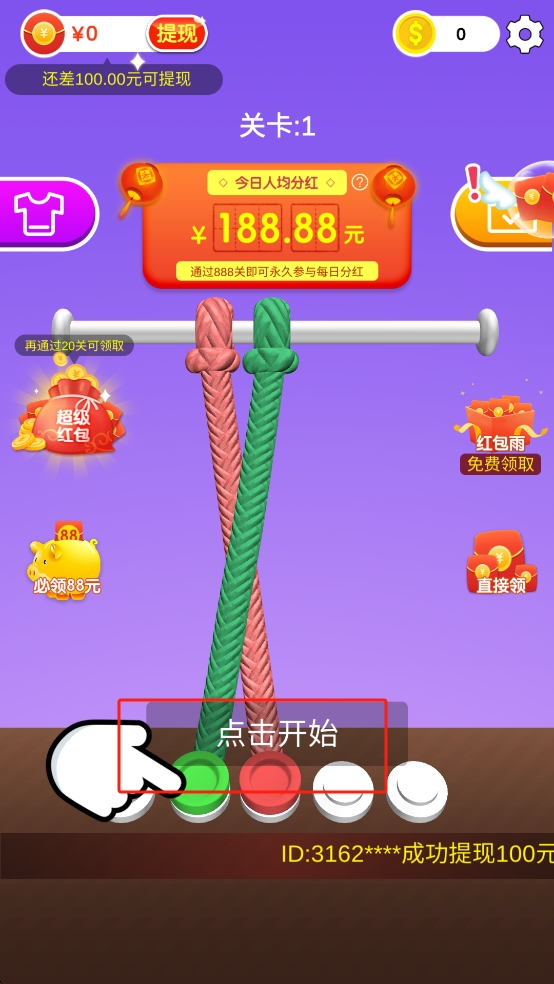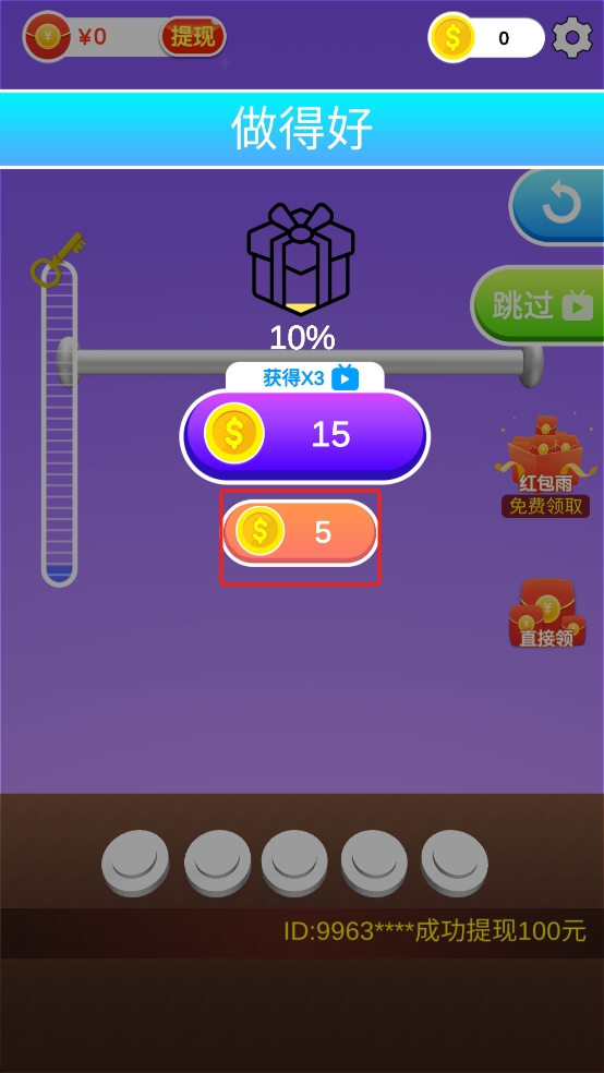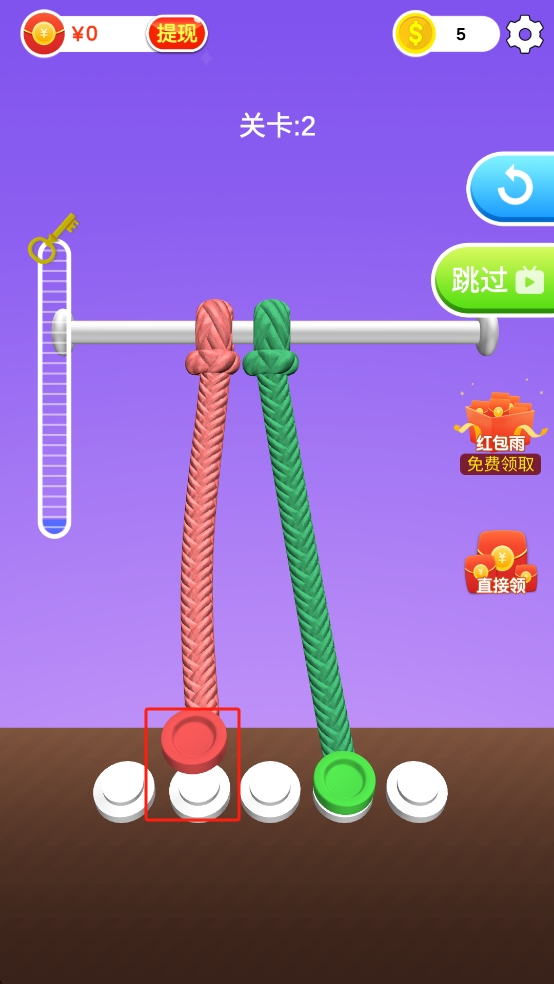 3、繩索完全解開后可以領(lǐng)取5金幣獎勵,可看廣告獲得3倍獎勵,積累金幣解鎖新關(guān)卡、道具,提升解繩效率。