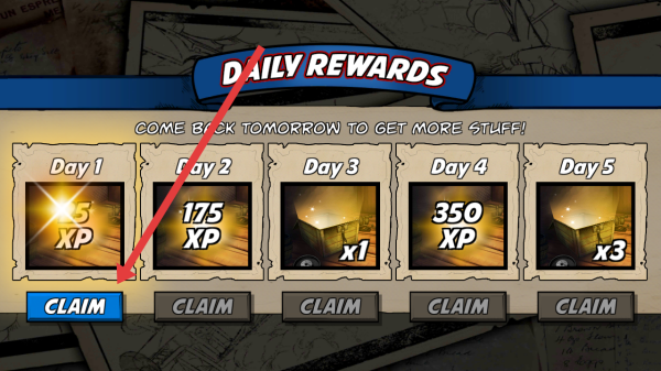 2、進(jìn)入游戲的每日獎(jiǎng)勵(lì)界面,點(diǎn)擊Day1下方藍(lán)色CLAIM的按鈕,領(lǐng)取15XP的首日登錄獎(jiǎng)勵(lì)。