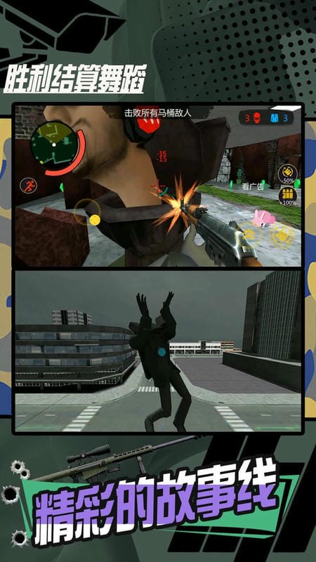 2、在城市的不同區(qū)域接受豐富任務(wù),遭遇更多類型的敵人,利用馬桶怪、監(jiān)控人等角色的獨特技能展開戰(zhàn)斗,收集任務(wù)獎勵提升戰(zhàn)力,解鎖新的探索區(qū)域。