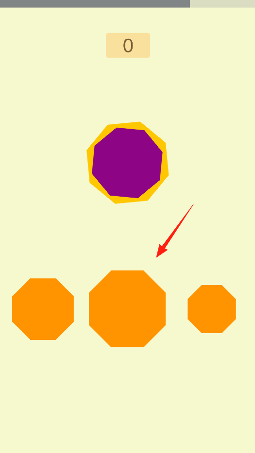 2、出現(xiàn)紫色多邊形嵌套黃色邊框的圖形,下方有三個(gè)橙色多邊形,觀察上方圖形輪廓,選擇尺寸適配的橙色多邊形,拖動(dòng)使其嵌入紫色圖形位置,完成形狀匹配。
