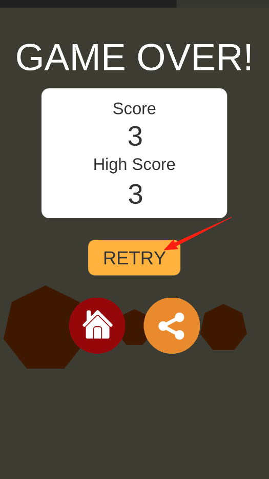 3、挑戰(zhàn)失敗后,進(jìn)入GAME OVER界面,顯示得分與歷史最高分,點(diǎn)擊RETRY按鈕,重新開啟游戲,,能暫別挑戰(zhàn)或分享成績(jī),通過重新嘗試,優(yōu)化操作,突破之前得分。