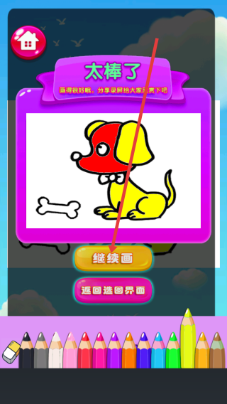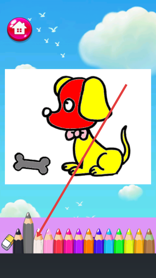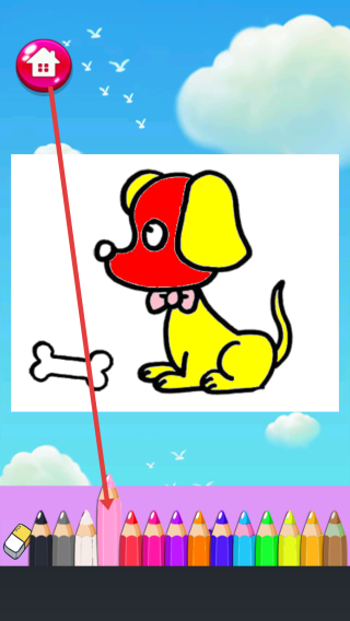 1、兒童涂色填色進(jìn)入游戲時(shí),選擇自己喜歡的圖案如小狗,從下方選彩色鉛筆,點(diǎn)擊圖案區(qū)域涂色。