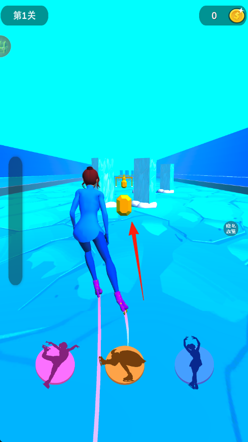 1、操控滑冰角色,沿箭頭指向,獲取黃色道具可能加分或加速,推進(jìn)關(guān)卡。