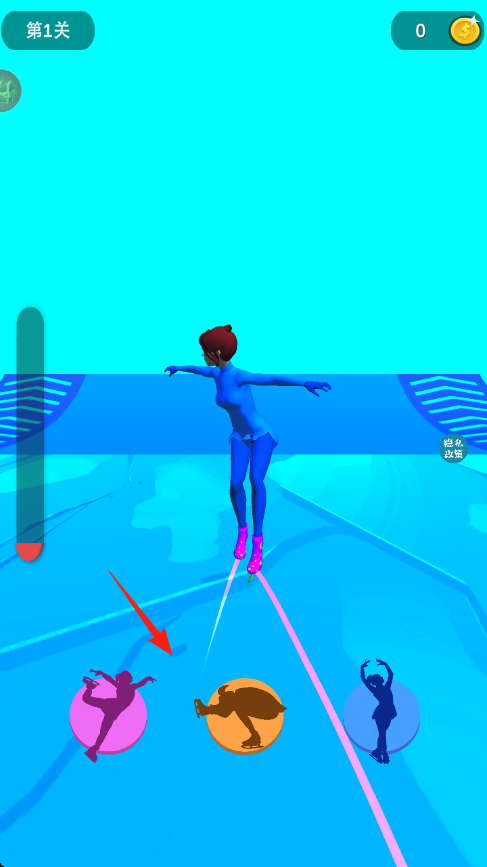 2、按箭頭指向,點(diǎn)擊粉色動(dòng)作圖標(biāo),切換滑冰姿勢(shì),可能改變速度或得分。
