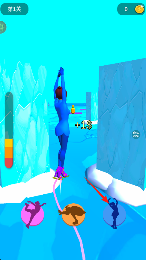 3、點(diǎn)擊藍(lán)色動(dòng)作圖片,箭頭指向,變換動(dòng)作,通過冰面障礙,收集金幣+1$,完成第1關(guān)。