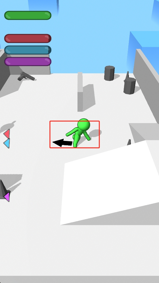 1、開局我們操控綠色火柴人,跟隨箭頭指引移動,優(yōu)先靠近場景里的手槍,拾取武器為后續(xù)戰(zhàn)斗做準備。