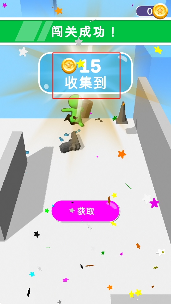 3、闖關成功后界面顯示獲得15金幣,點擊粉色獲取按鈕領取獎勵,積累金幣可用于解鎖道具或提升角色,再規(guī)劃進入下一關。