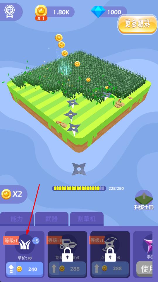 2、在收集金幣的過程中,可利用下方的功能選項(xiàng)提升飛鏢的性能,如點(diǎn)擊選項(xiàng)可升級(jí)草價(jià)等。