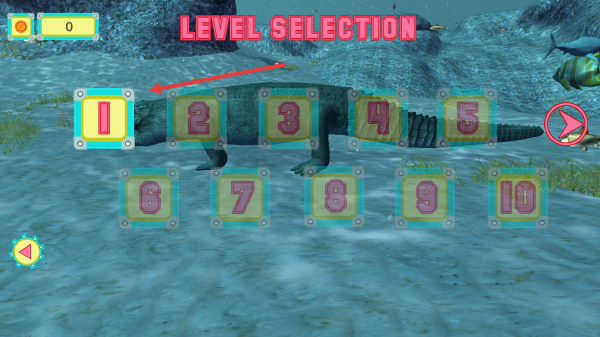 1、點擊鱷魚身上播放鍵。進(jìn)入關(guān)卡選界面優(yōu)先選LEVEL1,熟悉虛擬搖桿左側(cè)控制鱷魚移動。