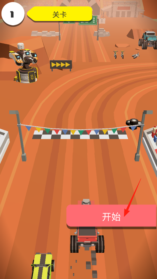 1、進(jìn)入游戲關(guān)卡界面,看到賽道與多輛賽車,點(diǎn)擊開(kāi)始按鈕,觸發(fā)賽車啟動(dòng),在越野賽道上競(jìng)速,讓賽車駛?cè)胭惖?,為操控賽車跨越障礙爭(zhēng)取勝利做準(zhǔn)備。