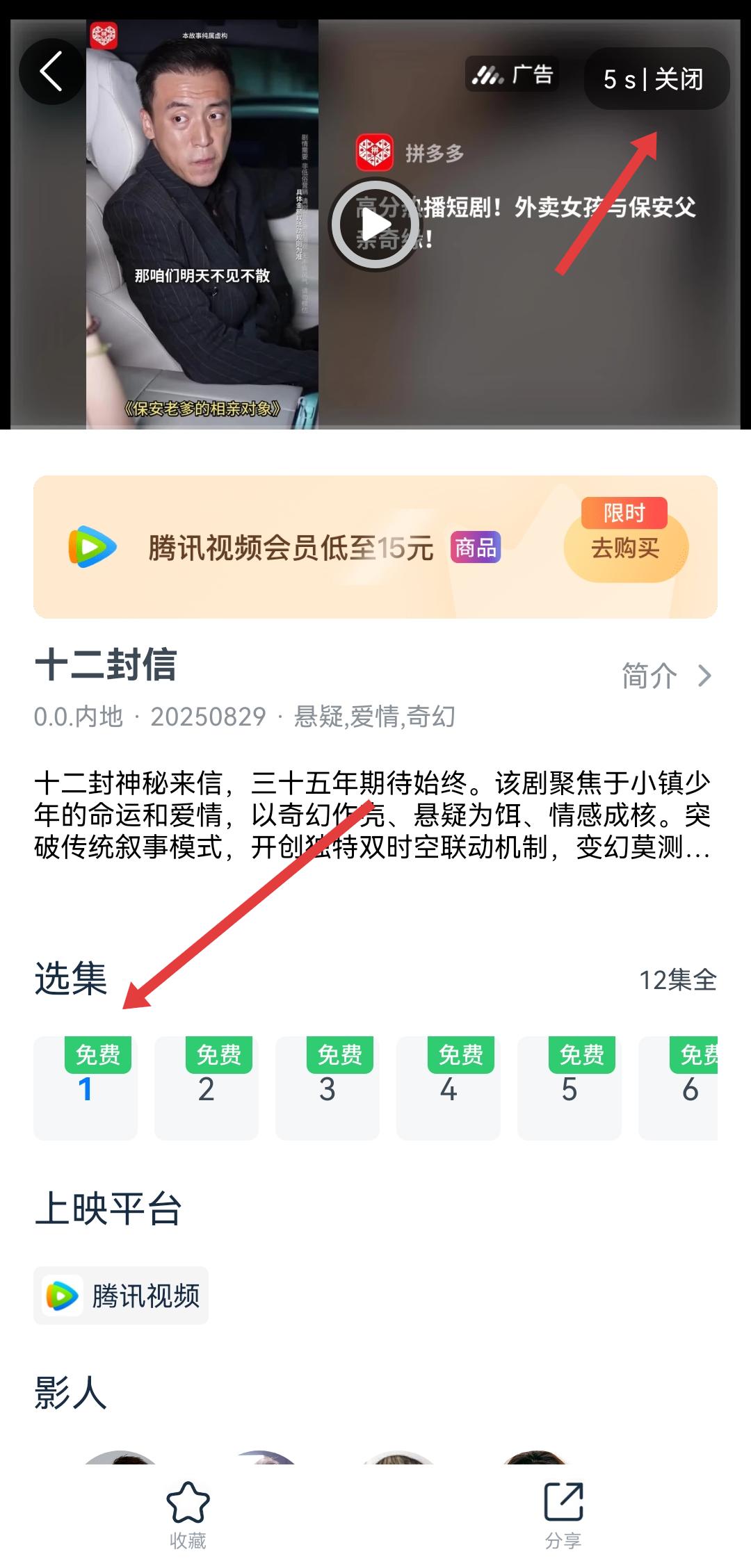 2、在劇集詳情頁(yè)面,等待廣告倒計(jì)時(shí)結(jié)束或點(diǎn)擊關(guān)閉廣告,然后在選集區(qū)域選擇要觀看的集數(shù)。