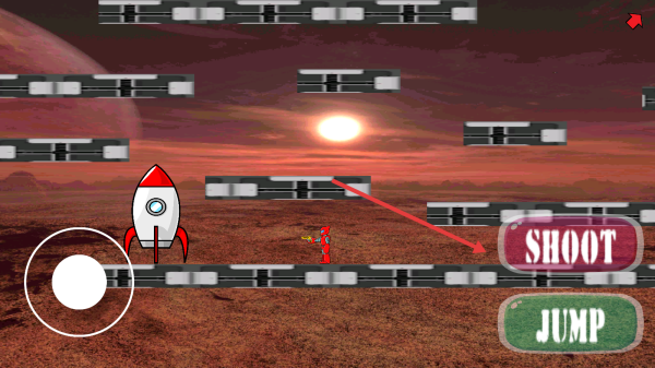 2、操控角色移動(dòng),遇到障礙或敵人時(shí),點(diǎn)擊右側(cè)SHOOT按鈕射擊,借JUMP按鈕跨越地形。