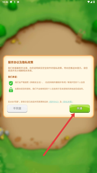 1、進(jìn)入游戲界面,出現(xiàn)服務(wù)協(xié)議及隱私政策提示,點擊同意按鈕,確認(rèn)接受條款進(jìn)入游戲。