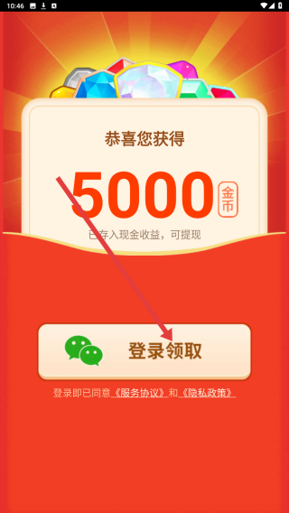3、完成授權(quán)后,彈出恭喜獲得5000金幣提示,點擊登錄領(lǐng)取按鈕,獲取獎勵開啟游戲體驗。
