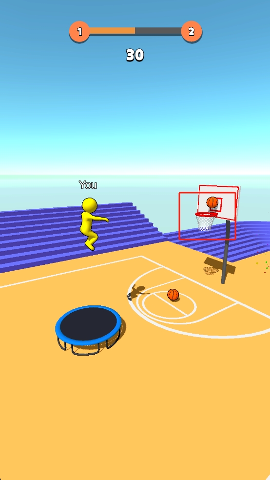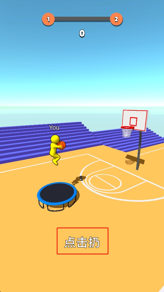 1、首先我們操控黃色角色站在蹦床上,看準(zhǔn)時(shí)機(jī)點(diǎn)擊屏幕下方的按鈕,借助蹦床彈力將籃球投向籃筐。