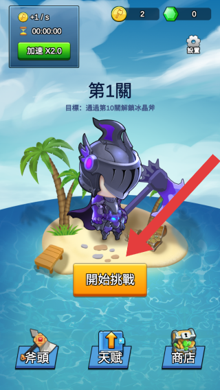 1、呈現(xiàn)第1關(guān),目標:消滅第10層解凍冰晶斧,點擊開始挑戰(zhàn)可進入關(guān)卡戰(zhàn)斗,屬于闖關(guān)戰(zhàn)斗類的關(guān)卡選擇頁面。