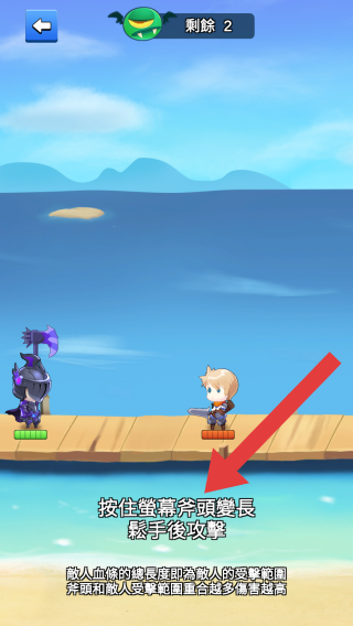 2、根據(jù)文字按住屏幕斧頭變長,松手后攻擊,是操作提示,還有關(guān)于敵人血量、受擊範圍等戰(zhàn)斗機制說明,屬于動作戰(zhàn)斗類對戰(zhàn)教學(xué)或戰(zhàn)斗環(huán)節(jié)。