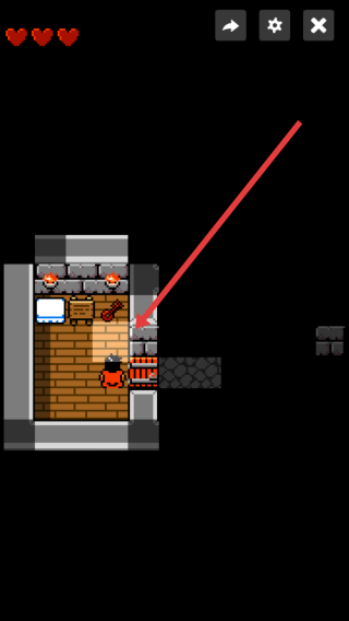 3、在游戲場景內(nèi),通過點擊屏幕操控角色向箭頭指引的石門方向移動,探索房間,開啟冒險關(guān)卡。