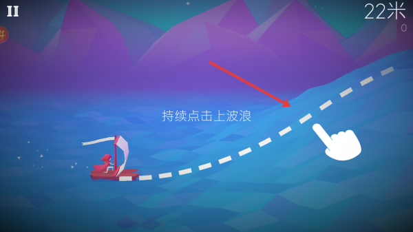 1、進入游戲,按提示持續(xù)點擊上波浪,操控帆船借助波浪前行,適應(yīng)海上航行節(jié)奏。
