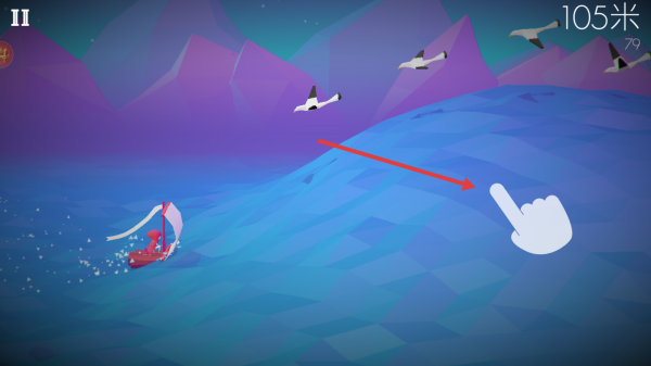 2、航行中跟隨箭頭指引點擊海面,讓帆船利用波浪加速,注意躲避海鷗等海上元素。