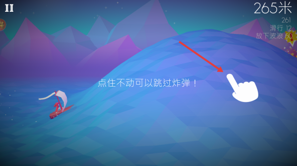 3、遇到炸彈時,按提示點住不動跳過,保障帆船安全,持續(xù)推進完成海上冒險。