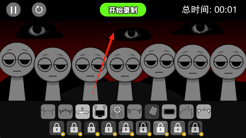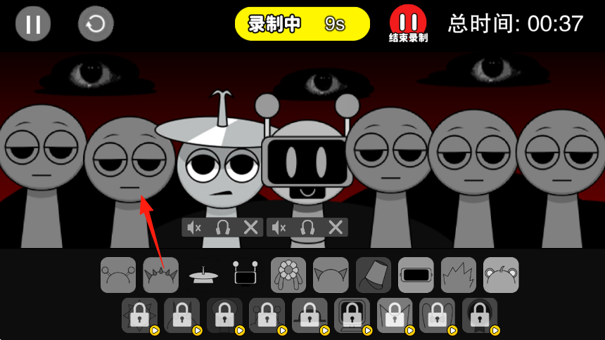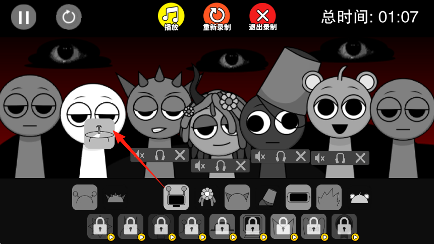 3、完成角色設(shè)計(jì),可播放查看效果重新錄制調(diào)整,退出錄制保存,通過解鎖更多部件底部鎖狀,創(chuàng)作多樣怪物角色。