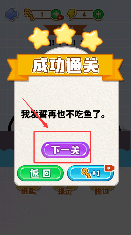 4、通關(guān)后點(diǎn)擊紫色的下一關(guān)按鈕繼續(xù)挑戰(zhàn)。