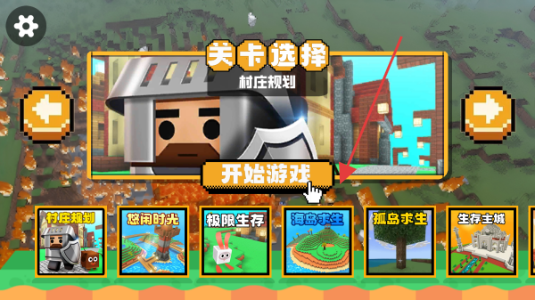 2、在關(guān)卡選擇界面,選擇如村莊規(guī)劃、海島求生等關(guān)卡,點(diǎn)擊開(kāi)始游戲按鈕,進(jìn)入對(duì)應(yīng)關(guān)卡進(jìn)行探索。