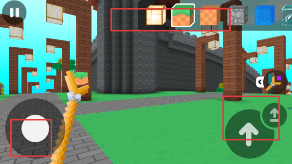 3、進(jìn)入游戲場(chǎng)景,利用左側(cè)虛擬搖桿移動(dòng)角色,右側(cè)功能按鈕進(jìn)行跳躍、放置方塊等操作,按關(guān)卡要求完成建造任務(wù)。