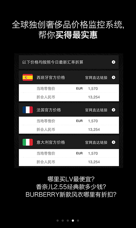 球獨(dú)創(chuàng)奢侈品價(jià)格監(jiān)控系統(tǒng),幫你買得最實(shí)惠 覆蓋全球100個(gè)頂級(jí)品牌,超過10萬個(gè)熱門單品,實(shí)時(shí)推送打折信息。