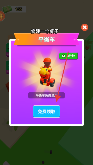 3、游戲中出現(xiàn)修建一個桌子提示時,可選擇免費領取平衡車等道具,提升經(jīng)營效率,推進游戲進程。