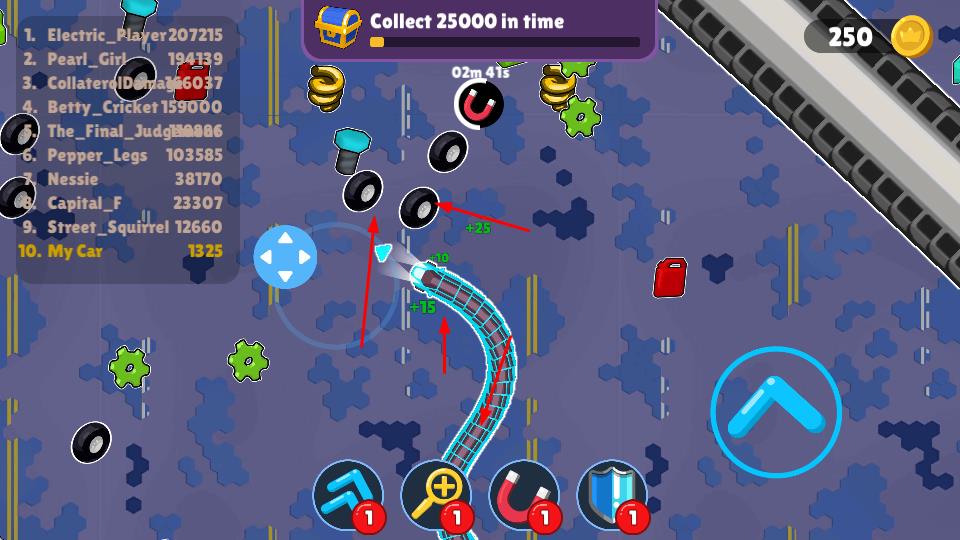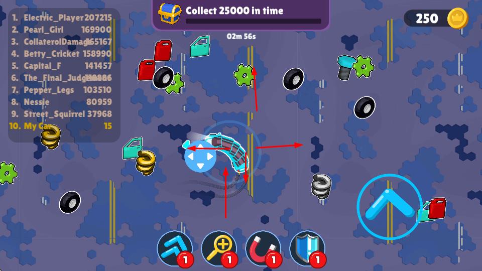 2、根據(jù)紅色箭頭提示,改變汽車(chē)移動(dòng)方向,避開(kāi)障礙物,同時(shí)盡可能多地收集零件,增加分?jǐn)?shù)。