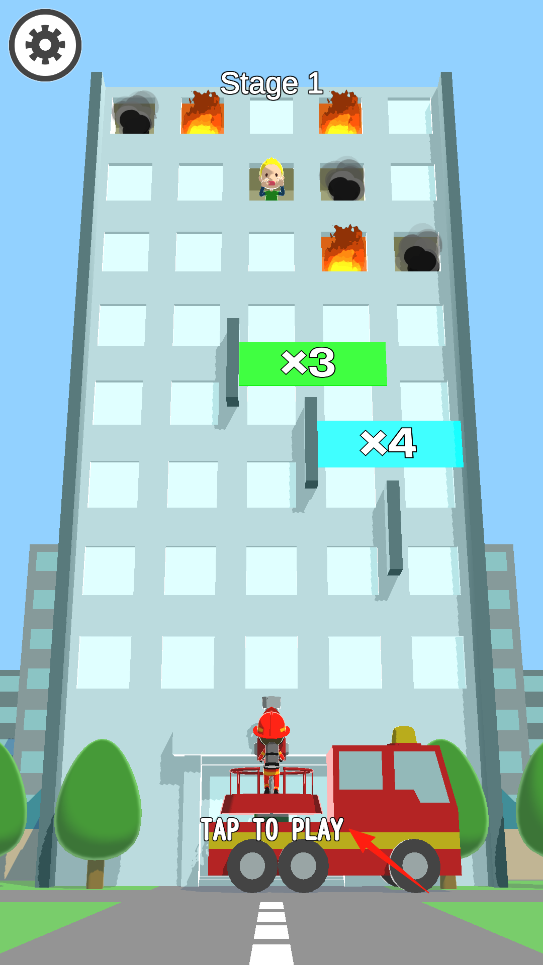 1、進(jìn)入游戲場(chǎng)景,看到火災(zāi)大樓與消防車,點(diǎn)擊TAP TO PLAY,啟動(dòng)救援行動(dòng),借助點(diǎn)擊開(kāi)始機(jī)制,操控消防員展開(kāi)營(yíng)救,通過(guò)操作,規(guī)劃救援路徑,感受模擬救火的初始互動(dòng)。