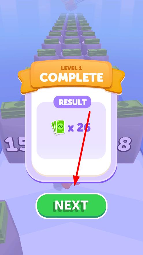 3、成功通過所有障礙,電能傳輸達(dá)標(biāo)后,關(guān)卡顯示“LEVEL 1 COMPLETE”,獲得鈔票獎(jiǎng)勵(lì),點(diǎn)擊“NEXT”按鈕進(jìn)入下一關(guān)。
