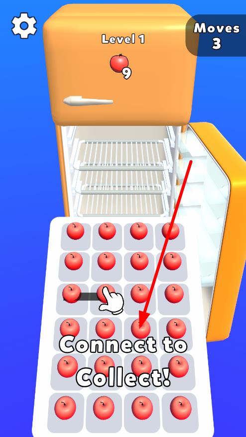 1、進入Level1,查看冰箱上需收集的蘋果數(shù)量9個,依據提示“Connect to Collect!”,點擊面板蘋果開始連線消除,消耗步數(shù)Moves推進。