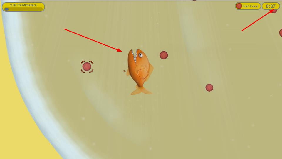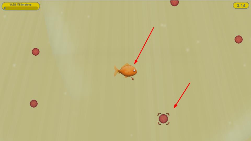 2、在游戲場景,操控小魚移動,靠近紅色圓形食物并吞噬,實現(xiàn)成長進化。
