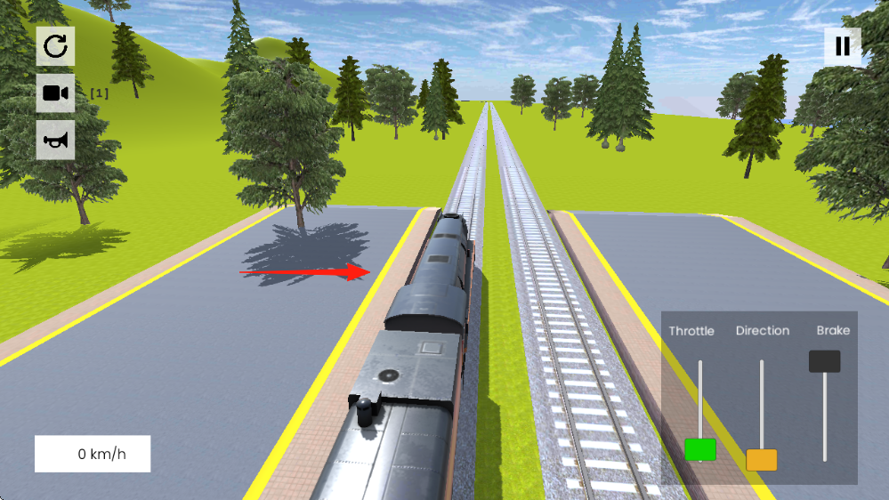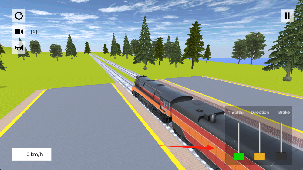 2、用Direction方向桿,黃色調(diào)整行駛方向,Brake剎車,黑色減速停車,按箭頭指引,操控火車通過軌道。